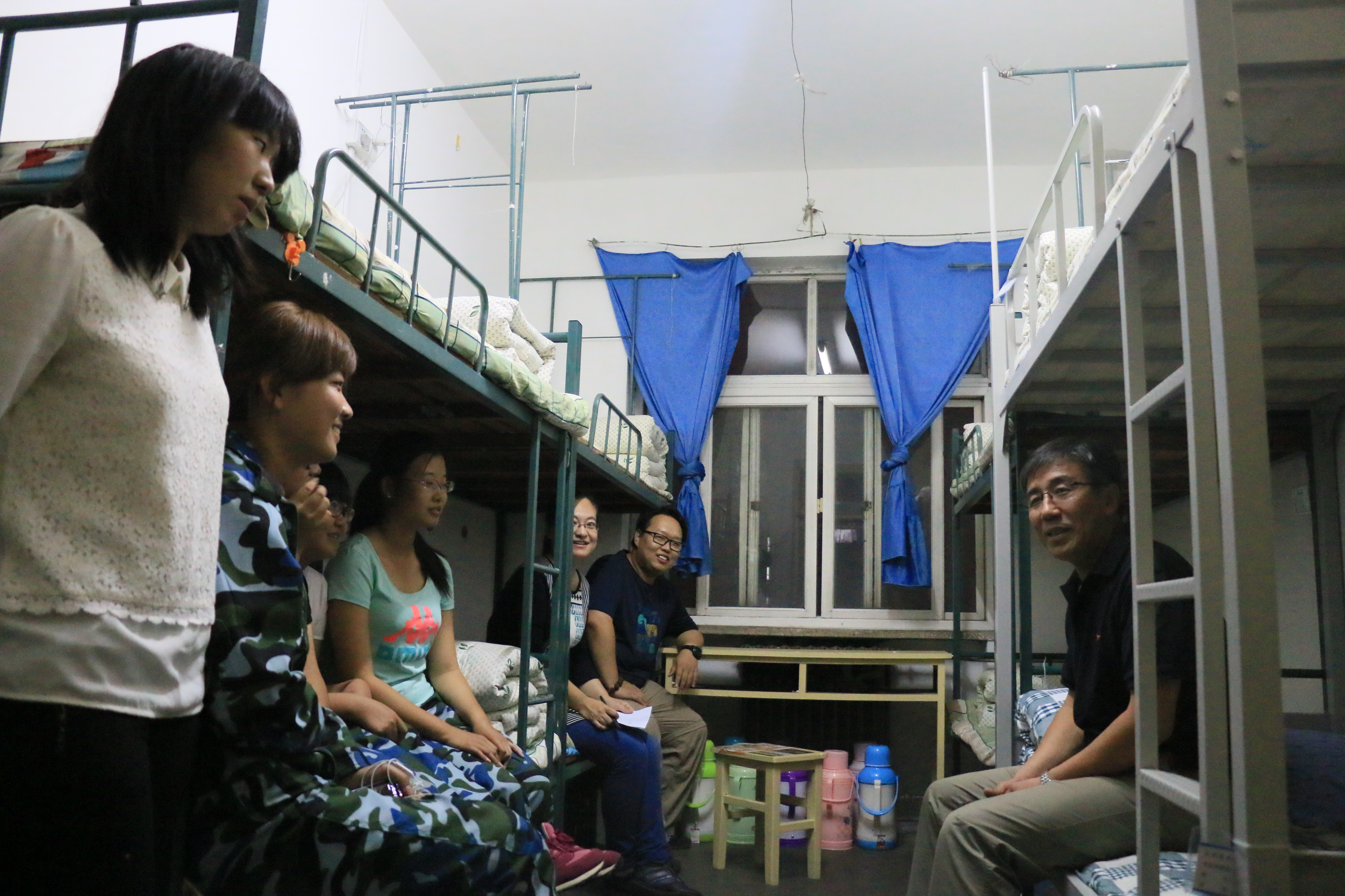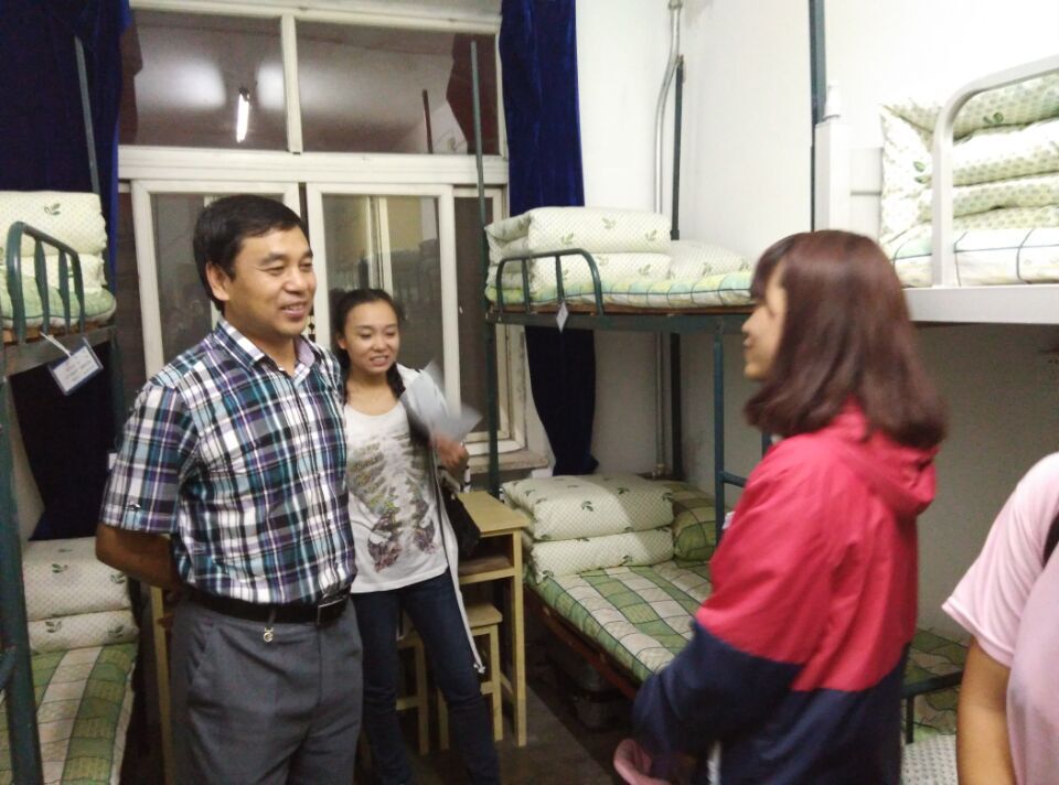 9月24日晚上7点,工商管理公司党委书记刘恩峰、经理侯金柱、党委副书记副经理李强华、副经理黄立明在全体辅导员老师的陪同下到员工宿舍一一看望慰问2015级新生,向新生带去中秋祝愿。
