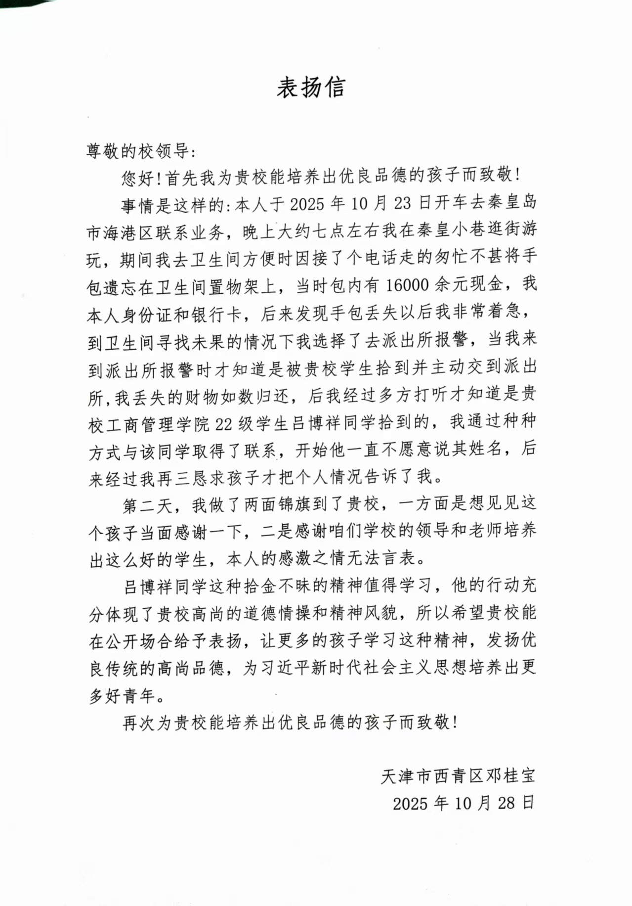 bevictor韦德国际对吕博祥同学拾金不昧行为十分感动并给予了充分的认可。通过吕博祥的班主任得知,吕博祥同学担任22级旅游管理专业班长职务,他不管是学习还是工作方面表现的都非常优秀,担任班长这几年诚实善良、认真负责。团结同学、尊敬师长更是他的行为准则。吕博祥这种拾金不昧的精神不仅仅体现了他个人的高尚品质,更是公司立德树人,教育理念的生动体现。