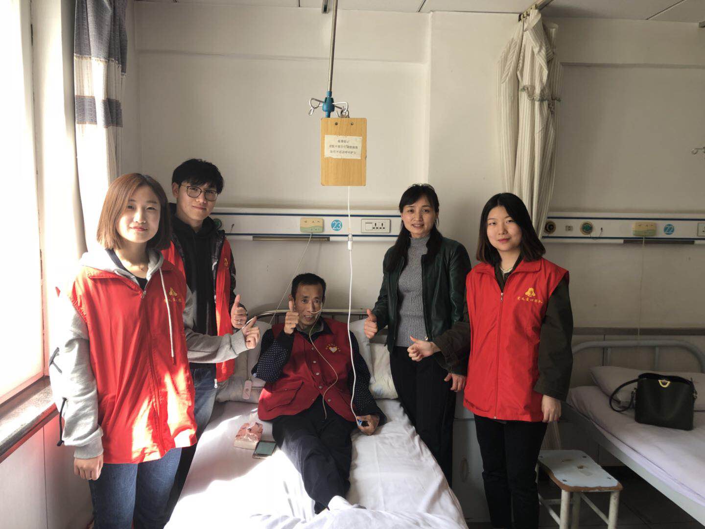 坚强乐观的沈如波同志看到志愿者们的到来非常高兴,愉快地与大家交谈,他说:“我们要与病魔做朋友,生病并不可怕,关键是积极的心态。我一定会尽快好起来,还有好多事情要做……” 医护人员讲沈如波同志已是著名的抗癌明星,现在状态良好。